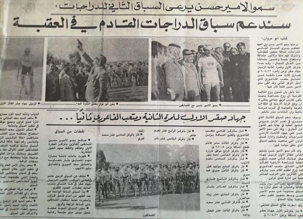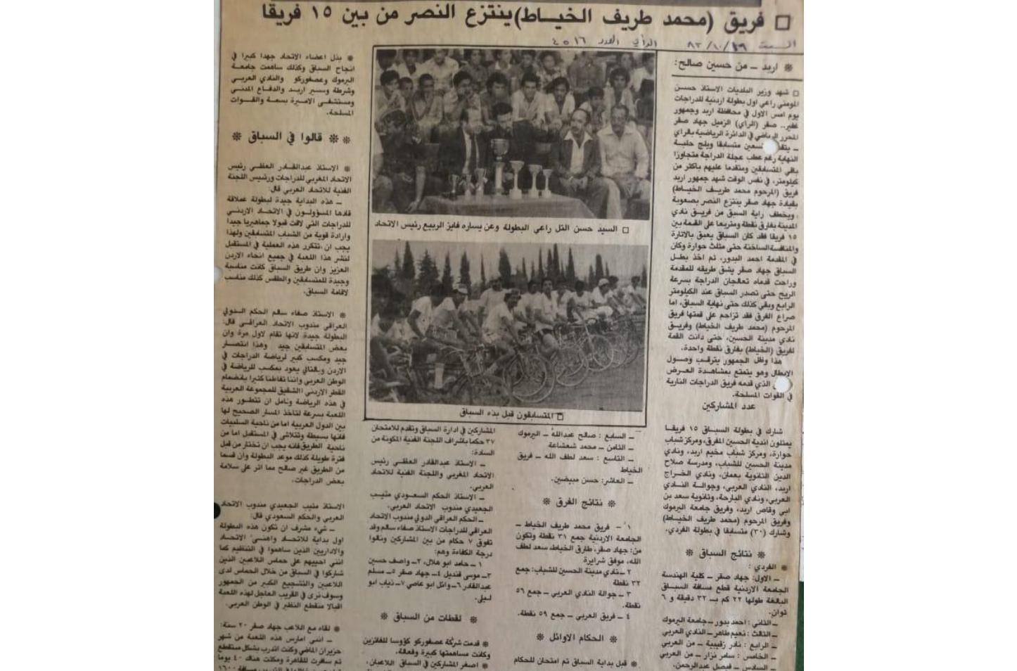 Additionally, 1983 saw the establishment of the Tareef Al-Khayyat Cycling Club, the first specialized cycling club in the Arab world and the Middle East. The club launched its first race under the patronage of His Royal Highness Prince Hassan bin Talal on the University of Jordan campus, initiating a series of local and international events organized by the Jordan Cycling Federation and its affiliated clubs, including Tareef Club, the Arab Club, Mafraq Club, and Ma'an Club.